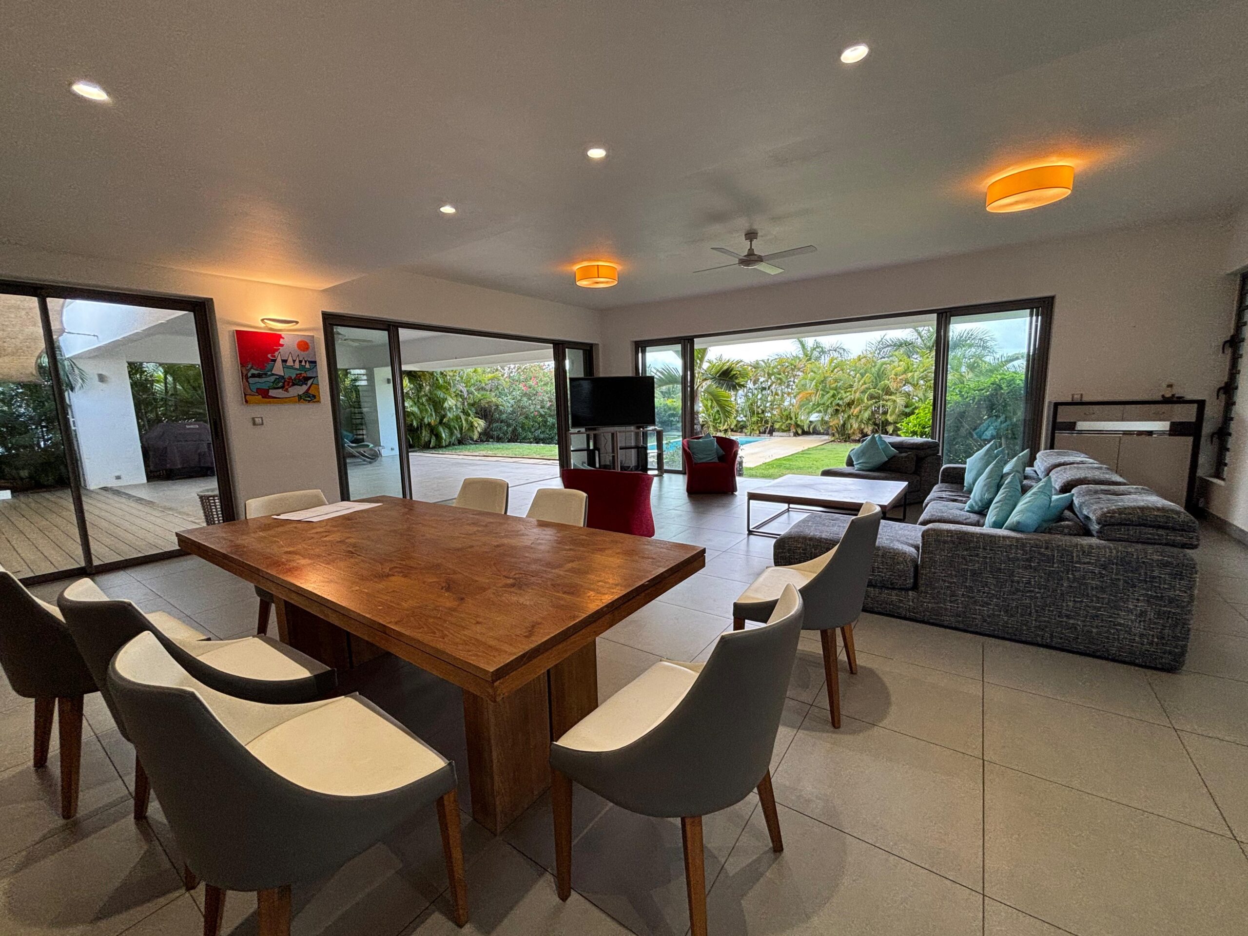 Grand open space ouvert sur le jardin paysager et la piscine privée